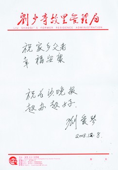 今年11月24日是劉少奇誕辰110周年,此次來(lái)參加紀(jì)念活動(dòng)以及昨日追憶活動(dòng)的劉愛(ài)琴是近五年來(lái)第一次回家鄉(xiāng)!凹亦l(xiāng)變化很大,發(fā)展也很好,如果父親看到這些變化,相信也會(huì)感到很欣慰的!眲(ài)琴說(shuō)。對(duì)家鄉(xiāng)父老,劉愛(ài)琴深深牽掛。昨日在劉少奇紀(jì)念館,劉愛(ài)琴專門托本報(bào)向家鄉(xiāng)父老問(wèn)好,書寫了“祝家鄉(xiāng)父老幸福安康”,同時(shí)寄語(yǔ)本報(bào):“祝長(zhǎng)沙晚報(bào)越辦越好”。
