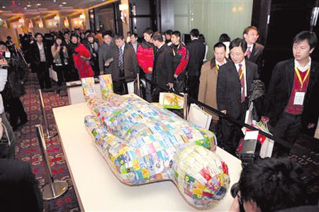 不久前,國(guó)內(nèi)的金融界人士匯聚北京,但在會(huì)議期間,他們被現(xiàn)場(chǎng)一件當(dāng)代雕塑給震撼了,這是一個(gè)身長(zhǎng)3.3米,用去1720張銀行卡、充值卡和消費(fèi)卡,使用100米銅線,完全采用漢代手工技藝制成的“金縷玉衣”,外形和1968年出土的那件文物一模一樣。據(jù)刁建中介紹,這件作品的名字叫《金縷玉衣2008》,創(chuàng)作歷時(shí)15個(gè)月,從多年收集的萬余張卡中精心挑選了1720張卡。他表示,選擇“卡”作為介質(zhì),因?yàn)榭ㄗ鳛樽髌返乃囆g(shù)元素具有廣泛的社會(huì)屬性,是對(duì)人們消費(fèi)的一種梳理和認(rèn)同。刁建中希望通過這種承載大量社會(huì)信息的卡借用金縷玉衣的形式來表達(dá)當(dāng)代的社會(huì)現(xiàn)象。