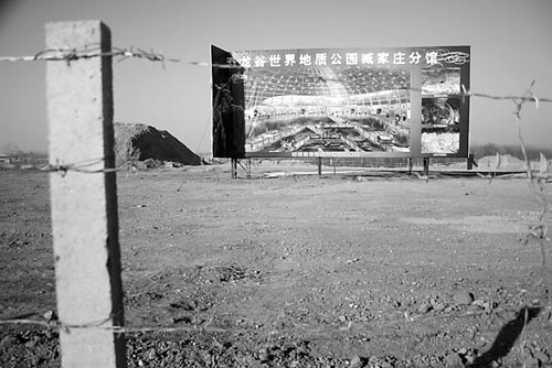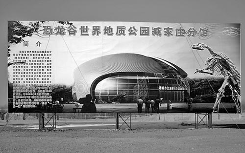 在諸城市政府網(wǎng)站上,關(guān)于最新的招商引資項(xiàng)目中,就有兩個關(guān)于建設(shè)恐龍化石地質(zhì)公園的項(xiàng)目。在臧家莊發(fā)掘現(xiàn)場,一個蛋殼形狀的場館規(guī)劃圖屹立在發(fā)掘現(xiàn)場。工作人員介紹說,自2008年以來,先后在此出土大量恐龍化石,該化石群規(guī)模之大、品種之多世界罕見,是古生物科考的重大發(fā)現(xiàn)。為保護(hù)好該化石群,諸城市決定在此建設(shè)恐龍谷世界地質(zhì)公園分館。該館外形設(shè)計(jì)為裂開的恐龍蛋殼形狀,寓意新發(fā)現(xiàn)、新收獲、新希望。館內(nèi)展示主要采取底層立體展示、化石平面展覽、 地下化石層隧道展示等,項(xiàng)目占地約100畝,建筑面積3500平方米,總投資2000多萬元,于2008年9月開工建設(shè),計(jì)劃2009年7月1日前建設(shè)并投入運(yùn)營。分館建成后,與恐龍谷世界地質(zhì)公園主場館遙相呼應(yīng),形成“一龍一蛋” 的旅游格局!敖ǔ芍蟠蠹揖涂梢皂樦鎏莸降叵,看看發(fā)掘現(xiàn)場,看看恐龍化石,這些在不遠(yuǎn)的將來都會實(shí)現(xiàn)!惫ぷ魅藛T告訴記者。工作人員所說的主場館,就是即將建立在這次發(fā)掘出最大鴨嘴龍化石的庫溝村村北。在這條東西走向的化石隆起帶上,將建成一座全新的恐龍化石地質(zhì)公園。“ 這里發(fā)掘的恐龍化石,顏色還真挺特別,紅色、褐色的特別多,可能與這里的土質(zhì)有關(guān)吧!周圍都是紅土。 而在臧家莊那邊,發(fā)掘的化石顏色大都是黑色或者白色!