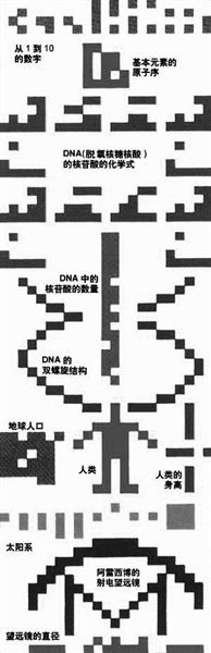 1974年11月16日下午,位于波多黎各的大型射電望遠鏡向武仙座方向發(fā)送一個給外星人的信號,這個信號持續(xù)3分鐘。信息中以符號的形式描述了1~10的數字、太陽系、地球和人類的DNA。這條信號以光速飛向25000光年以外的一個星團。也就是說,假如那里有外星人收悉我們的信號,然后再給我們作出回復的話,我們會在5萬年后收到它。