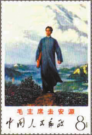 1968年8月1日,中國發(fā)行了一枚面值8分的郵票,是根據(jù)《毛主席去安源》的油畫設(shè)計(jì)的。圖中,毛澤東身穿藍(lán)布長衫,手拿雨傘,在烏云翻滾的天空下凝神走來,非常形象傳神。