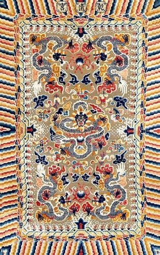 2.壁毯主花紋中的正龍呈威嚴(yán)端莊之神態(tài),四行龍與正龍相互呼應(yīng),組成了表現(xiàn)帝王之尊的五龍圖。