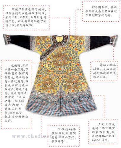 “錦衣玉食”常被用來形容奢華的生活狀態(tài),而在中國傳統(tǒng)的各種服飾中宮廷帝王穿著的龍袍算得上是頂級(jí)華服了。昨天,包括乾隆、嘉慶、光緒皇帝龍袍在內(nèi)的30件清宮服飾在北京港澳中心舉行的北緯拍賣預(yù)展現(xiàn)場亮相。
