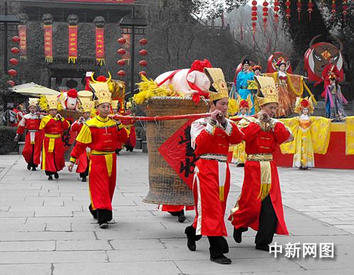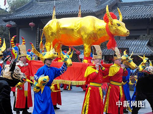 在杭州宋城景區(qū),記者看到,俏皮可愛的芒神手執(zhí)神鞭向一頭碩大的金牛揮去。每抽出一鞭,便引來圍攻群眾歡呼雷動(dòng)。身穿九龍絳紗袍的大宋皇帝手執(zhí)高香,引領(lǐng)文武百官、后宮嬪妃登壇祭拜,一步一停,口中念念有詞;繼而,臺(tái)下上百位演員裝扮各路神仙載歌載舞,鞭炮鼓樂響徹云霄……這便是2009年杭州宋城景區(qū)的主打民俗演出“鞭打春!钡膲延^場(chǎng)景。