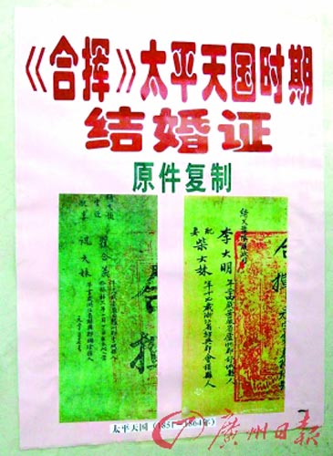 《合揮》中合是結(jié)合,揮是憑證之意,太平天國(guó)時(shí)期廢除封建買賣婚姻,男女雙方要求結(jié)婚時(shí),先經(jīng)過(guò)主管婚姻的婚娶官批準(zhǔn),然后發(fā)給繪有龍鳳圖記的《合揮》婚書,方能成婚。