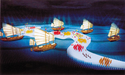 就這樣,一個可能是啟發(fā)了后來北京奧運開幕式中的“卷軸畫卷”的創(chuàng)意就此誕生!熬磔S畫”可謂廣東創(chuàng)意的“縮小版”,廣東的想法是整個場館的地面都成為屏幕。而“卷軸畫”則是長147米、寬27米的LED屏幕。