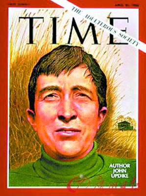 1968 年的小說《夫妻們》描寫了小鎮(zhèn)中產(chǎn)階級(jí)家庭組織的換妻派對(duì),令他榮登當(dāng)年4 月26 日《時(shí)代》周刊的封面,大標(biāo)題赫然印著“通奸社會(huì)”(The Adulterous Society)。2005 年他的小說《村莊》入圍英國(guó)老牌文學(xué)雜志《文學(xué)評(píng)論》一年一度的“最差性愛描寫?yīng)劇遍L(zhǎng)名單,還好,性愛描寫最終不敵蓋爾斯克倫的《溫克勒》,沒有得獎(jiǎng)。