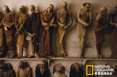 在歐洲,對(duì)尸體進(jìn)行干燥處理和保存算是西西里島的獨(dú)門(mén)絕活。意大利其他地區(qū)也有此類(lèi)現(xiàn)象,但絕大部分還是在西西里,這里的生者與死者之間有著更為緊密的聯(lián)系。有些神父對(duì)這種保存尸體寄托哀思的方式心懷不安,把其中一些從地下墓穴里運(yùn)出掩埋到墓地里。沒(méi)人知道埋了多少,也沒(méi)人知道這種干尸究竟有多少具。這讓人不免疑惑:為什么會(huì)有人這么做?把腐化的尸體拿來(lái)展覽用意何在?