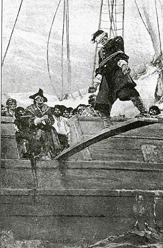 然而現(xiàn)實與藝術(shù)表現(xiàn)有著巨大的差距,歷史學(xué)家在查閱了浩瀚的史料后得出結(jié)論,這種電影里常見的海盜刑罰似乎并沒有在加勒比海時代出現(xiàn)過,唯一一次“走木板”的官方記錄出現(xiàn)在一百年后的1829年,一艘200噸的荷蘭貨船在加勒比海被海盜船截獲,在將貨物搶劫一空后,海盜強(qiáng)迫船員們依次“走木板”蹈海。只有一位船員因交待了財寶藏匿的處所而得到海盜們的寬恕,這位船員輾轉(zhuǎn)回到歐洲后向人們講述了這次可怕的經(jīng)歷,于是,“走木板”成為后世藝術(shù)作品里海盜們的招牌行徑。