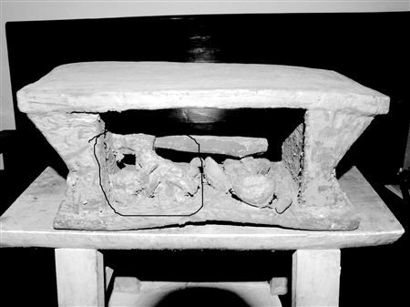 中空部分展現(xiàn)的是一間磨房的情景,有磕碓、碾子(均為剝谷碾米之用)、籮筐、小雞等物,有的固定,有的可動(dòng)。趁勞動(dòng)間隙,一對(duì)男女裸體在磨房的角落里緊緊擁抱。從身體形態(tài)和姿勢(shì)上,可看出他們正在歡愛(ài)。此外,工作人員還發(fā)現(xiàn)一具陶制的“且”長(zhǎng)約10厘米,直徑約2.5厘米。