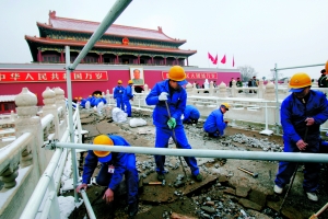 昨日下午2時(shí),天安門前金水橋東西兩側(cè)的“品級(jí)橋”橋頭,已設(shè)2米多高的青灰色圍擋。東側(cè)的“品級(jí)橋”上,20多名佩帶天安門管委會(huì)施工工作證的工人,手持鐵錘和鑿子席地而坐,一點(diǎn)點(diǎn)“開墾”著橋面。據(jù)橋頭的安全員說(shuō),由于橋面空間較小,限制了進(jìn)場(chǎng)施工人員數(shù)量,工人已分為兩班晝夜施工,保障工期。