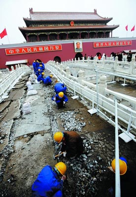為迎接新中國(guó)成立60周年,天安門金水橋從昨日起開始修繕。天安門管委會(huì)昨日消息稱,此項(xiàng)工程預(yù)計(jì)在5月1日前完工。來(lái)自北京市文物局官網(wǎng)的招標(biāo)公告顯示,工程財(cái)政撥款資金94.64萬(wàn)元。