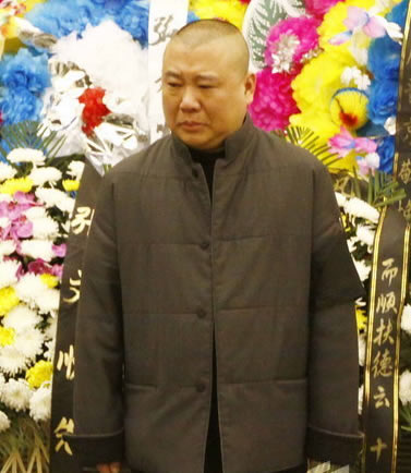 上午7點(diǎn)44分,德云社內(nèi)部的吊唁活動(dòng)率先進(jìn)行。郭德綱、王惠夫婦,于謙、王海、李菁、何云偉、曹云金等骨干演員率百名演職人員向張文順先生的遺體默哀,禮畢后人人號(hào)啕大哭,痛不欲生。雙眼紅腫、哽咽不斷的郭德綱嘆息說,張先生走得太早了,自己失去了一位摯友,他愿老人能夠在天享福,歡笑來生。郭德綱承諾會(huì)照顧張夫人,并用心培養(yǎng)張文順的外孫寧云祥在德云社說好相聲。