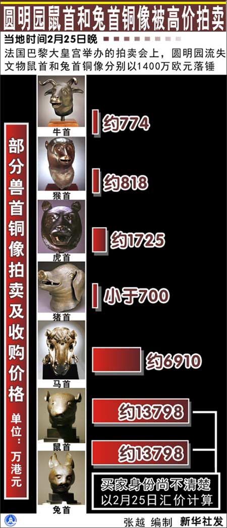 據(jù)美國《紐約時報》網(wǎng)站2月26日報道,從中國掠走的兩尊獸首銅像25日晚以總額近3590萬美元的價格(不含傭金)成交。此前,獸首拍賣遭到了中國強(qiáng)烈卻徒勞的抗議,要求停止拍賣的法律訴訟也以失敗告終。