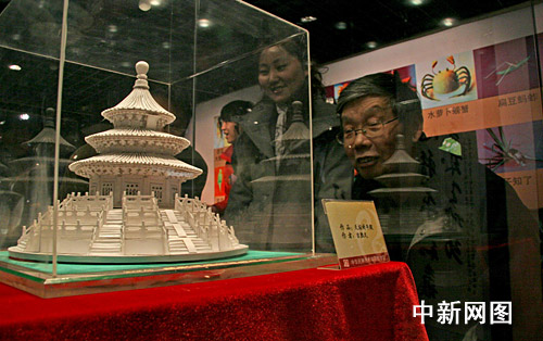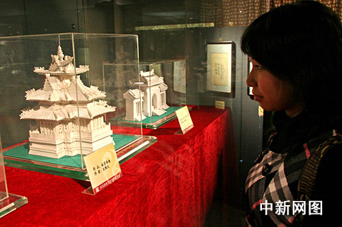 中新網(wǎng)二月二十八日電 (記者 甄雪原)“天壇祈年殿”、“故宮角樓”、“永安門城樓”、“岳陽(yáng)樓”等一些中國(guó)著名建設(shè),今天再現(xiàn)于北京中華民族藝術(shù)珍品博物館內(nèi)。然后這些古代名樓的建筑材料不是磚瓦,而是普通的白卡紙。這是中華民族藝術(shù)珍品博物館今天開幕的一個(gè)“紙模珍品展覽”上的作品。其作者是北京市崇文區(qū)人大常委會(huì)主任吉?jiǎng)倬谩?table border=0 cellspacing=0 cellpadding=0 align=left>