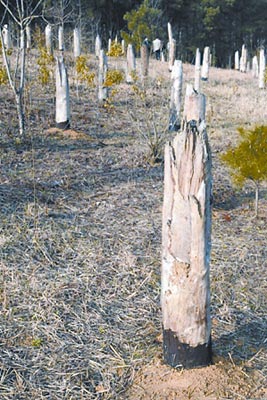 幾分鐘過后都溪林場馬家塘林區(qū)方圓400多畝的松樹林被成片成片地攔腰截斷,在一條斷續(xù)長約3公里、寬150米至300米的帶狀區(qū)域里只留下1.5米至4米高的樹樁并且折斷的樹干與樹冠大多都向西傾倒,長兩公里的四個林區(qū)的一人高的粗大樹干整整齊齊地排列在林場上。有的斷樹之間又有多棵安然無恙,個別幾棵被連根拔起,還有周圍的一些小樹有被擦傷的痕跡。
