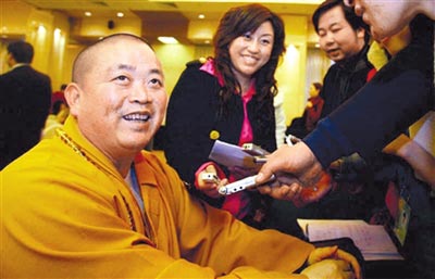 3月11日下午,全國人大代表河南團向媒體開放。會議之初,釋大師出門上洗手間,被各路記者圍住,隨后在工作人員“保護”下“突圍”。會議后半段,釋永信夾著公文包準備提前離會,沒曾想再一次被眼尖的記者們圍堵,釋大師嘟噥了一句“早知道應該早點走啊”,他再一次被工作人員“遣返”會場。