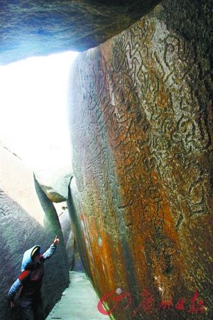 我們沿山路攀爬港灣旁邊的風(fēng)猛鷹山,不久便到達其中最大一幅巖畫所在地:藏寶洞。從遠處看,這只是一堆巨大的花崗石巖體,若從空中俯視,可以發(fā)現(xiàn)它像一只碩大的海蚌,微微張開一條縫,而巖畫就刻在這花崗石崩裂兩瓣后的平整的巖面上(見主圖)。