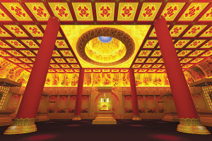 走進(jìn)展覽大廳,正中間就是出土于南京大報恩寺遺址名揚四海的七寶鎏金阿育王塔的主展區(qū),設(shè)計師用“天圓地方”來形容他對核心之處的設(shè)計理念。崇圣殿的大廳內(nèi)從地面到屋頂估計有9米高,記者看見施工單位搭起了3層高的腳手架,幾名工人正在為圓頂上色,“圓頂共制作了三圈,最大的一圈直徑2.4米,一圈比一圈縮小,這樣可以體現(xiàn)出一種神秘的層次感。18幅飛天壁畫盤旋在圓頂周邊,最高一圈內(nèi)畫上藍(lán)色的夜空,然后安裝LD最新燈光系統(tǒng),16盞射燈對應(yīng)的地方是方形的仿漢白玉基座,座上四邊是進(jìn)口的鋼制廊桿!庇浾咦铌P(guān)心的是基座上究竟陳列什么文物?無疑是大家都想要看到的,美麗無比的七寶鎏金阿育王塔。