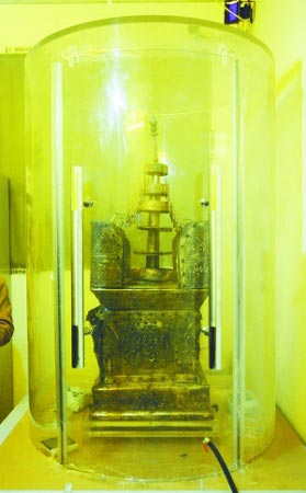 去年11月出函之后,阿育王塔一直被存放在特制的有機(jī)玻璃容器中,里面充入氮?dú)獗3趾銣睾銤瘛?個(gè)月過去了,“塔王”保存狀況良好,但有專家指出,鑒于阿育王塔的材料和結(jié)構(gòu)相對(duì)特殊,最好的辦法還是分類保存。