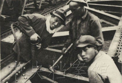 9. 1950年,天津制鋼廠生產(chǎn)模范徐敬生利用廢材做了三百四十多種器材,圖為他和工人們在做新的馬丁爐鋼架