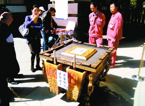 昨天中午,記者看到一只編號(hào)為0350的奧運(yùn)缶擺在該小區(qū)門前,其四周用鎖鏈與地面連接,缶上貼著“貴重物品,請(qǐng)勿觸摸”的紙條。旁邊坐著兩名自稱是中國(guó)金銀幣禮品網(wǎng)員工的女孩。據(jù)她們介紹,所賣的缶都是奧運(yùn)會(huì)開幕式上用過的,完好無(wú)損,均由單位以每個(gè)10萬(wàn)元左右的價(jià)格從官方拍得,除部分?jǐn)[在分公司展示外,剩下六七只準(zhǔn)備售賣,現(xiàn)在明碼標(biāo)價(jià)賣12.8萬(wàn)!懊恐惑径加惺詹刈C書和電子身份證書,可以上網(wǎng)核查真?zhèn)。擺在這里的是供展示,如果市民有興趣,可以留下手機(jī)號(hào)!辟u缶人員說(shuō)。