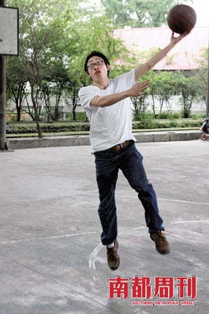 4月23日,范美忠?guī)в浾呋毓鈦喼袑W(xué)。穿著短袖衣服的他,就像一個剛下宿舍的大學(xué)生,在校門附近的籃球場打起了籃球。光亞幼兒園的小朋友正在場地的另一邊玩游戲,喇叭開得很大聲,而他似乎什么都看不見,聽不到,照樣小跑,上籃,跳投。