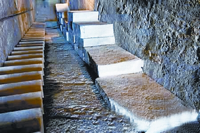 與連環(huán)翻板功能類似的,是鐵索吊石。主要是在墓道頂和墻壁隱蔽處固定若干金屬滑輪,利用滑輪將巨石吊起,懸于頂端。墓道地下鋪木質(zhì)蹺板,索鏈由石板而下,通過滑輪以隱蔽的方式連接蹺板,中間有掛鉤和脫鉤相接,遇外力壓迫可自動脫落。蹺板呈條狀,長寬根據(jù)墓道具體情況而定。吊起之石可在墓道頂部懸掛三層,各層互不相依,索鏈通過石上孔洞收縮進(jìn)出。