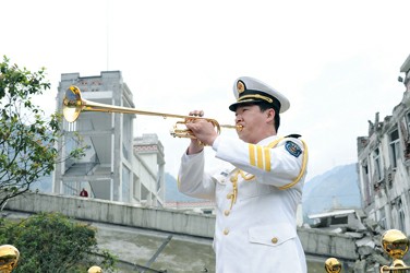 昨天下午,當中央領(lǐng)導同志和各界人士在汶川映秀鎮(zhèn)的地震記事墻前獻花時,小號聲聲相伴,旋律飄揚空中,音樂深情感人。記者經(jīng)過曲折采訪,了解到這首《思念曲》的作曲是中國人民解放軍軍樂團青年作曲家郭思達,演奏者是該團樂手王強。