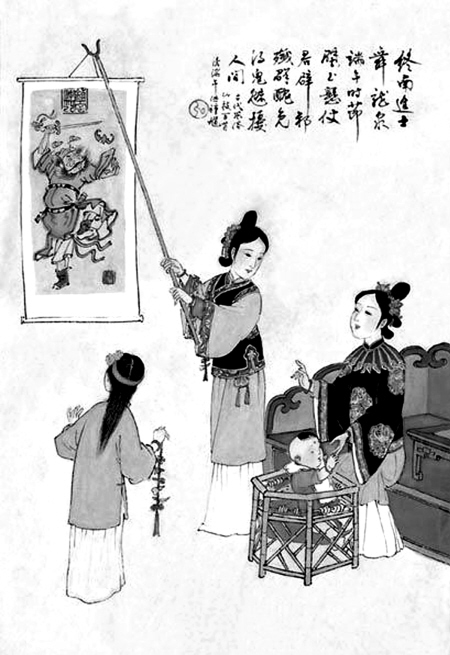端午節(jié)期間,有些地方還流行居室中懸掛鐘馗像的習(xí)俗,據(jù)清代《北平風(fēng)俗類征》記載:“五月初一至初五為端陽節(jié),午時以朱墨畫鐘馗像,用雞血點眼,俗稱‘朱砂判’者懸屋中,謂能驅(qū)邪!鳖櫟撛谒摹肚寮武洝分幸灿杏浭觯骸斑m逢端午,堂中掛鐘馗畫圖一月,以祛邪魅。”鐘馗乃唐朝有名畫家吳道子筆下的人物。據(jù)宋代《醉翁談錄》云:“除夜,舊傳唐明皇是夕夢鬼物,名曰鐘馗,既覺,命工繪畫之。至今人家圖其形,貼于門壁!毕鄠,唐明皇李隆基一次久病不愈,偶有一夜,夢見一大鬼捉去一小鬼,大鬼聲稱自己名鐘馗,試武舉未中,誓為皇帝陛下除天下妖孽。唐明皇夢醒,即刻病好。于是,便命吳道子將夢中的鐘馗捉鬼作成一幅畫,掛于宮中以避邪和鎮(zhèn)妖。