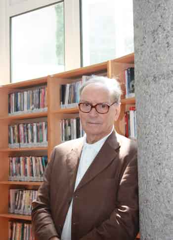 (本文圖片為站在意大利駐華大使館文化處圖書館內(nèi)的莫里康內(nèi)先生。周依奇 攝)