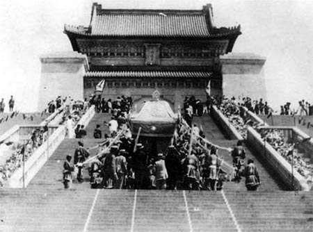 6月1日是“奉安日”。凌晨2時,“總理奉安委員會”特備的汽車已停在國民黨中央黨部二門前院內(nèi)。奉安總指揮朱培德、總干事孔祥熙以及各組正副主任都已到場,指揮各干事分別做好準備。從凌晨2起,沿中山路兩旁已擠滿送殯的群眾。3時20分,宋慶齡、孫科夫婦及子女、蔣介石夫婦、宋子文夫婦、宋靄齡、楊道儀(朱執(zhí)信夫人)、唐紹儀、陳少白、張繼、葉恭綽、頭山滿、犬養(yǎng)毅、梅屋莊吉、宮崎龍介以及國民黨全體中央委員、國民政府委員、葬事籌備委員、迎櫬專員、各國專使代表等陸續(xù)到達中央黨部禮堂門口等候。4時開始移靈典禮。典禮由胡漢民主祭,由孫中山家屬、親故及國民黨中央委員、國民政府委員、奉安委員、迎櫬專員、葬事籌備委員等恭候靈櫬,總干事孔祥熙執(zhí)旗前導。4時15分,獅子山炮臺開始鳴禮炮一百零一響,靈櫬移出大門,抬上縞素的靈車。汽車的四周扎掛白色彩球,覆蓋黨旗、國旗。靈櫬扶上汽車后,孫中山家屬、親故及各委員、各國專使等即加入第七行列,宋慶齡、陳淑英、孫琬、何香凝、宋美齡、宋靄齡等家屬和女眷在特制黑色布幔內(nèi)步行出中央黨部禮堂,分乘馬車隨靈護送,其余男賓則分左右兩列分別執(zhí)紼步送。4時25分,號兵吹起啟行號,靈車啟動。軍校學生200余名為護靈團,全副武裝,分列兩側,隨行護衛(wèi)。鐵甲車及騎兵連在前面開道,由一名騎兵長官騎黑馬,手執(zhí)開道旗。送殯各機關團體共分十行列,在事先指定的地點依次加入,隊伍長達五六里,朱培德任總指揮,姚琮、谷正倫、張治中分任各有關行列指揮。