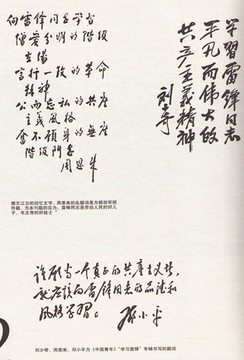 大約過了兩三天,《中國青年》雜志編輯部的同志打電話到毛主席辦公室,詢問主席是否已經答應寫題詞。當時,我了解毛主席已經看過《中國青年》雜志的信,但未作什么表示,我便如實地轉告。他們說,《中國青年》雜志在3月1日出版,能否請主席在2月25日前寫好,因為印刷還需要一周的時間。我將他們的要求報告了毛主席。毛主席讓我先擬幾個題詞供他參考。我回辦公室,思索了一番,擬好了十來個題詞,立即送給他。我現(xiàn)在還可以回憶起幾個題詞的大致內容。如:“學習雷鋒同志全心全意為人民服務的思想”、“學習雷鋒同志鮮明的階級立場”、“學習雷鋒同志艱苦樸素的作風”、“學習雷鋒同志毫不利己專門利人的優(yōu)良品德”,“學習雷鋒同志勤奮好學的精神”等等。