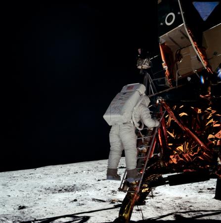 “陰謀論”者提出,月球表面只有一個光源——太陽,但宇航員卻出現(xiàn)了多個影子,說明是在攝影棚的燈光下拍攝的。事實(shí)上,登月艙的外形是極不平整的多面體,月面也是凹凸不平的。因此,登月艙和月面對太陽光的反射是多方向的,既有多個方向的鏡面反射,又有月面的漫反射,因而使宇航員出現(xiàn)多個影子,這正說明照片是在月球表面拍攝的。同理還可以解釋,為什么宇航員在登月艙的陰影里,但其身上的宇航服卻仍然是明亮的;為什么宇航員走下舷梯時,太陽明明是從他背后照過來的,但他的前胸卻是明亮的等等所謂的“怪異”現(xiàn)象。