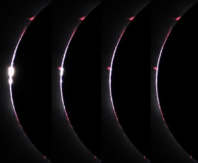 從初虧開(kāi)始,就是偏食階段了。月亮繼續(xù)往東運(yùn)行,太陽(yáng)圓面被月亮遮掩的部分逐漸增大,陽(yáng)光的強(qiáng)度與熱度顯著下降。當(dāng)月面的東邊緣與日面的東邊緣相內(nèi)切時(shí),稱為食既。此時(shí)整個(gè)太陽(yáng)圓面被遮住,因此,食既也就是日全食開(kāi)始的時(shí)刻。