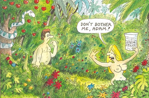 7月9 日,英國《太陽報(bào)》登出一張漫畫,在漫畫中,置身于伊甸園中的夏娃手持一只貼著“干細(xì)胞”標(biāo)簽的燒杯,一臉傲慢地說:“亞當(dāng),請別煩我!”對事件的中心人物納伊尼亞教授而言,倫理上的質(zhì)疑和爭議似乎并沒有給他帶來什么困擾。他認(rèn)為此項(xiàng)研究可以為那些想要孩子卻沒有能力的家庭帶去福音,而爭議則“完全可以通過法律最后進(jìn)行規(guī)約”。面對紛至沓來的媒體,納伊尼亞教授仍沉浸在實(shí)驗(yàn)成功所帶來的興奮之中:“這太令人興奮了!這些人造的精子有頭,有尾巴,也可以移動(dòng),它們具備能夠產(chǎn)生生命的一切特質(zhì)!”