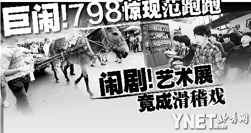 隨后,更多的“作品”給昨日的798平添了不少熱鬧——有趕馬車稱“驢子當(dāng)代藝術(shù)協(xié)會(huì)”的,有推小車賣尿壺稱“為人民服務(wù)”的,還有蒙上黑頭套逮誰(shuí)就問(wèn)“誰(shuí)能告訴我?guī)谀膬骸钡摹@場(chǎng)面倒是響應(yīng)了雙年展此前提出的“人人都是藝術(shù)家”的口號(hào)。不過(guò),記者從路邊一位不停抱怨的候補(bǔ)藝術(shù)家處得知,這些“創(chuàng)作”在開(kāi)幕前的一刻都說(shuō)不算數(shù)了,因?yàn)檫@個(gè)單元的策展人突然宣布退出雙年展,也就是說(shuō)以上的現(xiàn)場(chǎng)行為表演都不再是雙年展的組成部分,而他本人是一位律師,本來(lái)準(zhǔn)備搞個(gè)現(xiàn)場(chǎng)法律咨詢,“這也是我的作品啊,但是現(xiàn)在不想實(shí)施了!