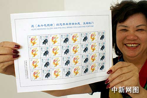 中新江蘇網(wǎng)鹽城8月17日電 (于從文 徐德鈺 李根) 上海吳女士16日來(lái)到江蘇鹽城,展示了以罕見(jiàn)的徐悲鴻畫(huà)豬圖為主題的個(gè)性化郵票設(shè)計(jì)效果圖。該連體郵票畫(huà)面中,一只火紅的剪紙鳳凰和一只黝黑的國(guó)畫(huà)豬相映成趣,給人以獨(dú)特的視覺(jué)感受。目前,這套郵票已經(jīng)交付印刷,將在本月底發(fā)行。