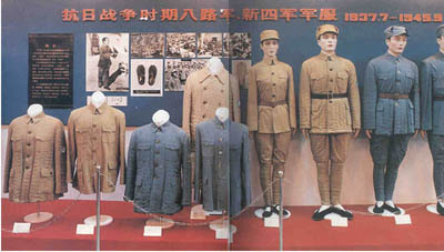 抗戰(zhàn)爆發(fā)后,紅軍改編為八路軍、新四軍,服裝、標志基本與國民黨軍隊相同。八路軍、新四軍都佩戴“青天白日”帽徽,但臂章上卻清楚地標明了自己的身份。八路軍佩戴“八路”長方形臂章,新四軍佩戴“新四軍”或“N4A”的臂章。八路軍的軍服顏色多為土黃色,新四軍多為灰色。