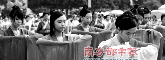 “每走一步、袖子怎么擺動(dòng),都有講究!睆V東省民俗文化研究會(huì)副秘書長、珠村民俗專家潘劍明是儀式主持,他透露,此次演出專門請(qǐng)來“漢禮”專家按歷史傳統(tǒng)還原場面。