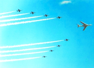 1954年國慶5周年閱兵時,受閱的武器裝備由繳獲的“萬國牌”換成了型號、口徑統(tǒng)一的引進或仿制的蘇式武器,武器裝備的機械化程度有了較大提高。1957年國慶閱兵,我國自行生產(chǎn)的伊爾-28型噴氣式轟炸機、殲5型殲擊機參加受閱,毛澤東主席在天安門城樓上高興地對外國朋友說:“我們自己的飛機飛過去了!”