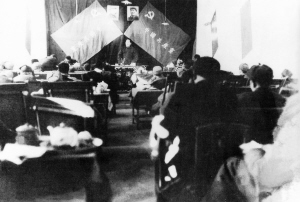 會(huì)場并不大,只有一百多平方米,是中央工委時(shí)期修建的大伙房。會(huì)場布置得非常簡樸,正面墻上懸掛著毛澤東和朱德的照片,兩邊墻上是鮮艷的中國共產(chǎn)黨黨旗。主席臺(tái)是一張舊長桌,上面一條花毛毯上鋪放了一張虎皮,為會(huì)場增添了一些威嚴(yán)。