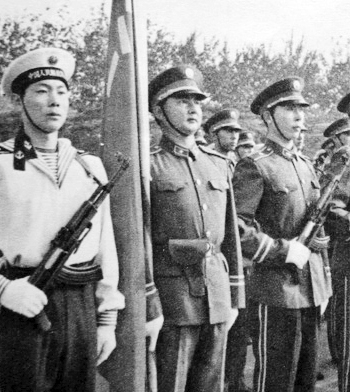 1984年國慶35周年閱兵,受閱陸?杖姴筷犎繐Q上85式新軍服:陸軍方隊的軍官全部著棕綠色毛料軍服,海軍方隊軍官著上身白色下身藏藍色軍服,空軍方隊軍官著上身棕綠色下身深藍色軍服。