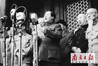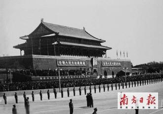 隨后,毛澤東等領(lǐng)導(dǎo)人乘車(chē)出中南海東門(mén),從故宮西華門(mén)南拐至闕右門(mén),再往南直達(dá)天安門(mén),登上了城樓的一百級(jí)臺(tái)階……