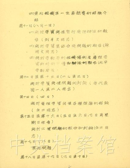 1949年7月23日至8月16日,全國(guó)工會(huì)工作會(huì)議在北平舉行。出席會(huì)議共有省、市、區(qū)72個(gè)單位的代表254名。毛澤東、朱德、周恩來等先后到會(huì)講話,李立三作了關(guān)于工會(huì)組織的報(bào)告。這次會(huì)議規(guī)定了當(dāng)時(shí)全國(guó)工會(huì)工作的中心任務(wù),就是在一年左右基本上把全國(guó)工人階級(jí)組織起來,以便在新中國(guó)的政權(quán)建設(shè)和經(jīng)濟(jì)建設(shè)中勝利地?fù)?dān)負(fù)起領(lǐng)導(dǎo)階級(jí)的歷史使命。會(huì)議通過了《關(guān)于勞資關(guān)系暫行處理辦法》等四個(gè)文件,明確了在新民主主義政權(quán)下處理勞資關(guān)系的正確途徑。