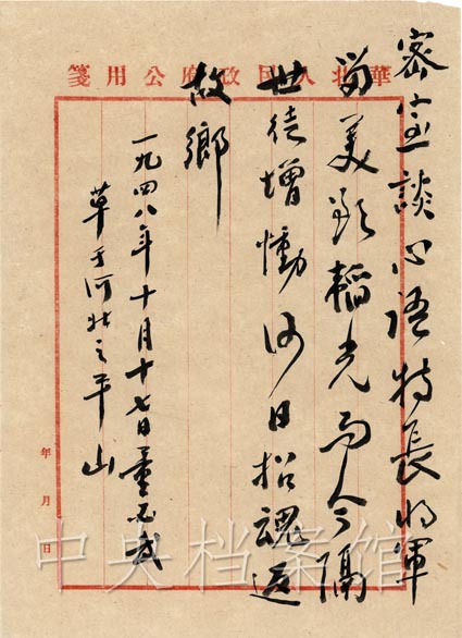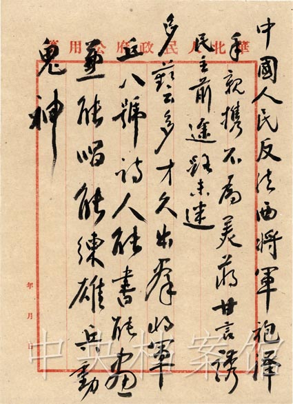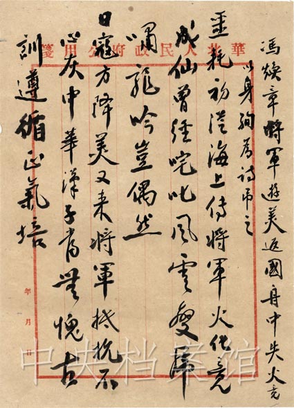 1949年 9月 1日,馮玉祥遇難周年祭日追悼會在北京舉行,出席者有李濟(jì)深、宋慶齡、周恩來、沈鈞儒、張瀾、何香凝、郭沫若、林伯渠、吳玉章、董必武及馮玉祥夫人李德全等 600余人。毛澤東、朱德及各民主黨派、各人民團(tuán)體送了挽聯(lián)花圈。毛澤東親筆題詞: “馮玉祥將軍逝世周年紀(jì)念謹(jǐn)致悼意。 ”周恩來在致詞中說:馮玉祥先生從一個典型的舊軍人轉(zhuǎn)變成為一個民主的軍人,他經(jīng)過了曲折的道路,最后走向新民主主義的中國。馮先生堅決地拒絕了美帝國主義對他的誘惑,毅然離美準(zhǔn)備回到中國解放區(qū),接受參加新政治協(xié)商會議的號召,不幸遇難,實(shí)值得大家紀(jì)念。