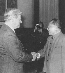 施密特:不能這么說。這一次我可算直接弄明白了,等級制在中國是如何起作用的。在同鄧小平談話的時候,我感受到了年邁的毛澤東仍然具有非同尋常的權(quán)力。按當(dāng)時中國的做法,鄧向我們說些什么,都要立刻匯報到毛那里去。不過,在西方民主國家,部長們同外賓的談話也要向外長甚至政府首腦本人報告,也同樣是不言而喻的事。我們西方人對外賓表態(tài)也會因此而小心翼翼。和鄧小平的那兩次會談,中國外長甚至就在座。當(dāng)時鄧很可能已經(jīng)知道,自己已經(jīng)上了要被打倒的名單。短短幾個月后,他果然再一次從政治舞臺上消失了。