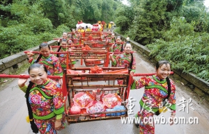 譚福朝要為兒子、兒媳操辦讓現(xiàn)代人只聽(tīng)說(shuō),很少見(jiàn)的舊婚俗儀式的消息不脛而走。不僅本鎮(zhèn)人,就連在相距60公里的江津城里上班,或在幾十公里外居住的四川省合江縣的居民,都如潮水般趕往具有百年古鎮(zhèn)之稱(chēng)的塘河。
