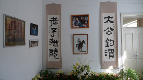 呂老遺像兩側(cè),是散文家黃苗子先生寫一副對聯(lián):“太公釣渭 老子猶龍”。呂彤林說:“父親 喜歡黃苗子的樸拙的書法,對姜太公和老子那種去留無意的境界很向往,對名利不以為意。”