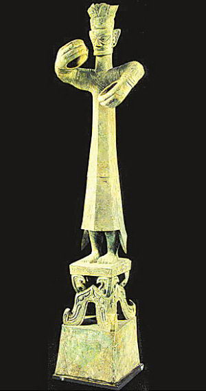 那么,“縱目”的蠶叢是什么樣子?在四川省廣漢市三星堆兩個商代大型祭祀坑中的上千件蜀國珍貴文物面世之前,歷代學(xué)者百思不得其解。三星堆出土的縱目青銅面具和青銅大立人,據(jù)考古學(xué)家論證,就是蠶叢的形象。這使得自古以來真?zhèn)文娴墓攀袷穫髡f成為信史,也為蠶叢縱目的傳說提供了實(shí)物佐證。